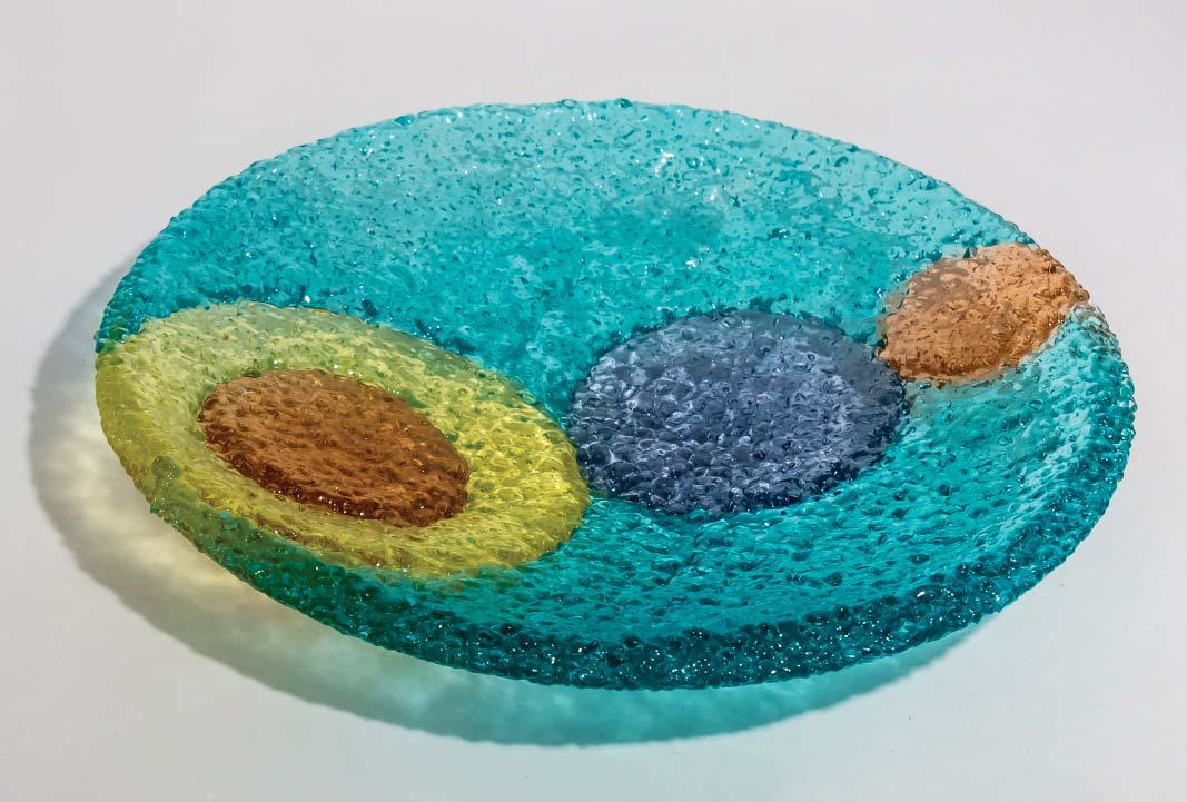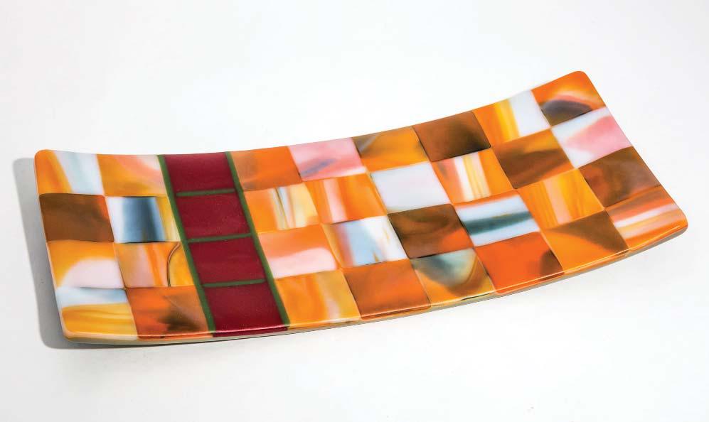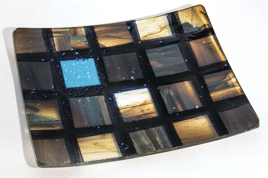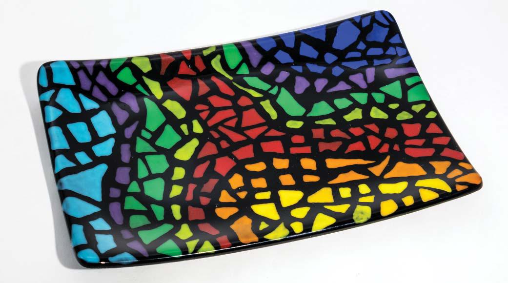 Яркая мозаика из разноцветных квадратов, объединённых фриттовым контуром. Вы узнаете, как сделать двойную обводку (контрастными цветами) и получить графичный, «лоскутный» эффект. Техника, которая превращает остатки стекла в стильное блюдо.