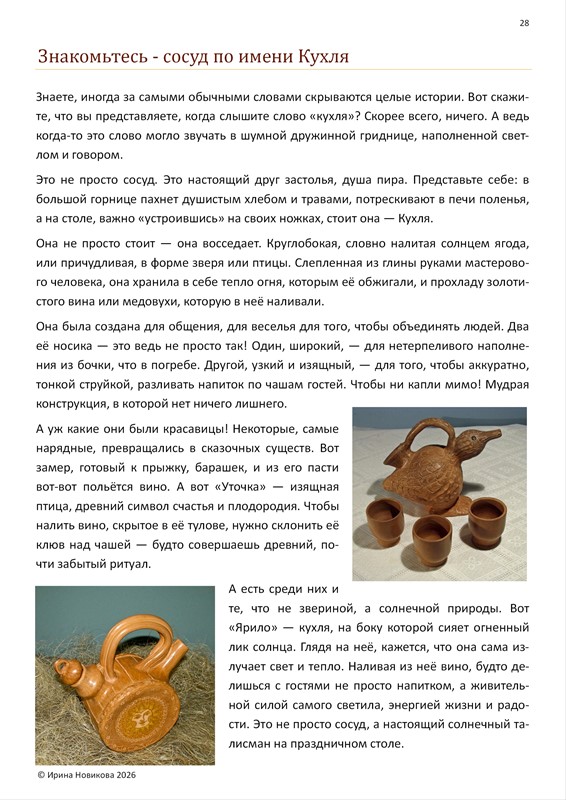 Завершая путешествие, вы выйдете за рамки кухни. Вы узнаете, как глина служила гигиене и вере, веселью и магии. Что такое рукомой (урыльник) — «глиняный родник» у порога? Как устроен бытовой подсвечник и какое значение имел свет? И, наконец, что может рассказать глиняная свистулька — не просто игрушка, но и древний оберег с голосом?